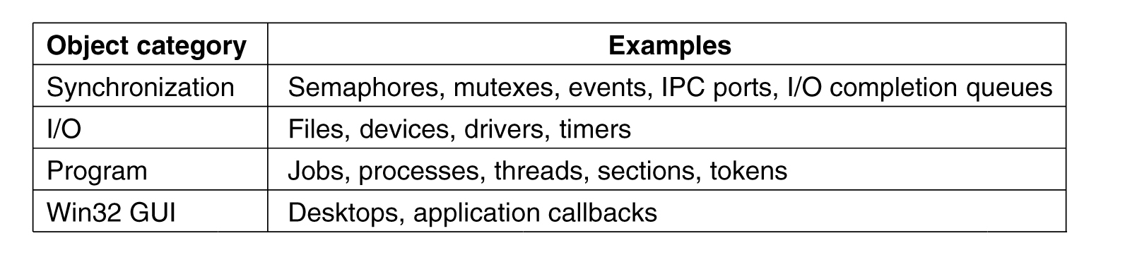 A key concept in NTOS programming is the object. An object can be a process, a thread, a file, a mutex, and so on. Each object has a handle which provides the means by which the object is manipulated by the user program. Each object also has a security descriptor which tells who can do what with it. These objects should not be confused with Object Oriented Programming Objects. Here are some examples