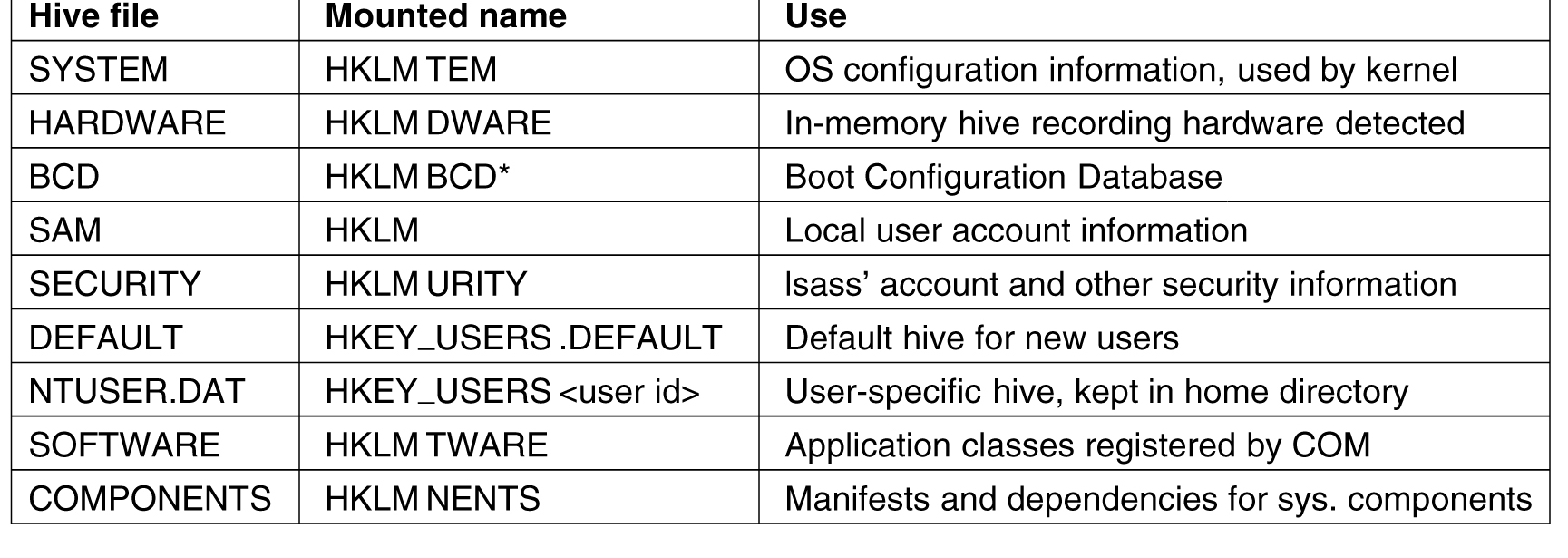 The registry is a special file system, (optimized for small files) attached to the NT namespace. The registry is organized into separate volumes called hives, which are like files. One of these hives is called SYSTEM. This is a file which keeps track of the system configuration. Other hives keep track of the configuration of installed software etc. Here is a list of some of the hives.