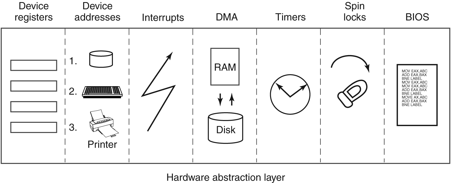 Windows can run on a number of different hardware architectures, not only different processors, but different support chipsets. In order to minimize the amount of hardware specific programming, the lowest layer of the OS is the Hardware Abstraction Layer (HAL). This layer translates all calls which deal directly with hardware into hardware accesses. Examples include the CPU itself, the Memory Management Unit, Interrupt controllers, physical devices, and the BIOS.