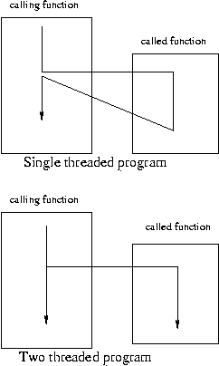When a traditional, single threaded program calls a function, execution stops in the calling function and starts in the called function. When the called function terminates, control returns to the calling function.