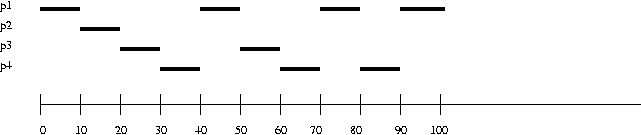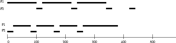Here is a simple example: Two jobs are submitted at the same time, P1 is compute intensive and P2 is I/O intensive. The compute intensive job will require 300 milliseconds to run, the I/O intensive job will perform 3 I/O operations. Each I/O operation takes 60 msec, and the process will need 20 milliseconds to process the data from one I/O operation. There is also an initial startup of 20 msec, so it requires a total of 80 msec of CPU time. The time slice is 100 msec.