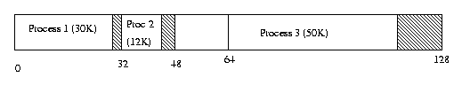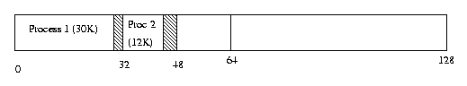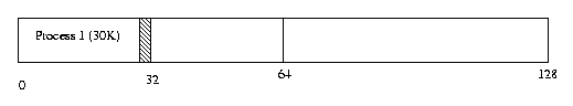 The first process to be loaded is 30K. The one large partition is divided into two partitions of 64K each, and one of these is divided again into two partitions of 32K each. The new process is loaded into one of these two partitions, leaving two empty partitions, one of size 32K and one of size 64K. There are two K of internal fragmentation, that is, memory inside a partition which is not used or usable. The memory layout looks like this.