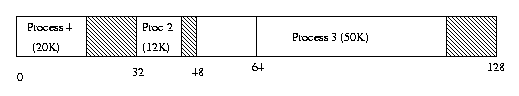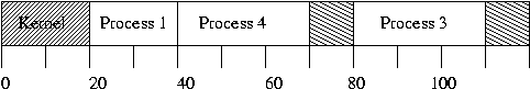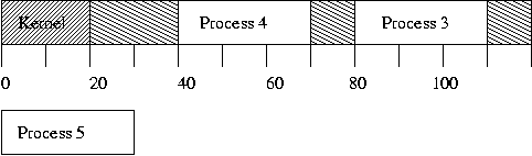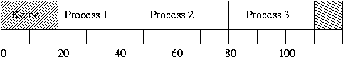 Consider a simple computer which has 120 units of memory, with addresses 1 .. 120. The bottom 20 units of memory are reserved for the kernel, which leaves 100 units for user processes. Each process has a fixed size which is known when it is loaded, and processes have to be loaded into contiguous memory.