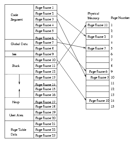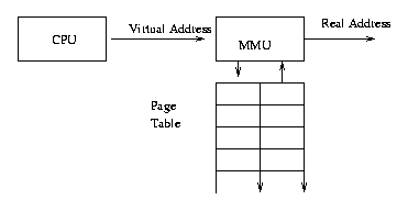 Note that there are two kinds of addresses (or two address spaces), virtual addresses and real addresses. Virtual addresses, also called logical addresses, are program generated. In a system without virtual memory, a physical address and a logical address are the same; the virtual address is placed on the address bus directly because it refers to a physical address in main memory. On systems with virtual memory, there is a mapping between virtual addresses and real addresses. In the above figure, supposed that code for the next instruction to be executed is in page frame 3. The running program only knows the virtual address. Rather than putting the virtual address directly on the address bus, the system sends this address to the Memory Management Unit or MMU. The MMU provides this mapping between virtual addresses and physical addresses. In the example above, this mapping would convert a virtual address in page frame 3 to a real address in page 10. The data structure which contains this mapping is called a page table.