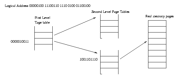Recall that in the page table design described above, each entry in the page table contained a pointer to real memory. In a two level page table, each entry in the first level page table contains a pointer to a second level page table, and the second level page table provides the address of the page in real memory. There are 210 or 1,024 entries in the first level page table, each pointing to a second level page table. The first level page table is always in memory, but only a handful of second level page tables are usually needed.