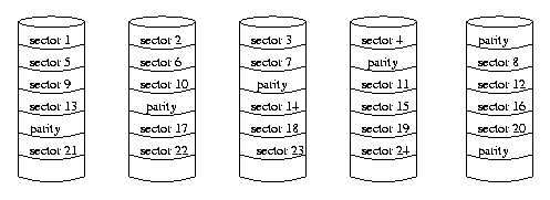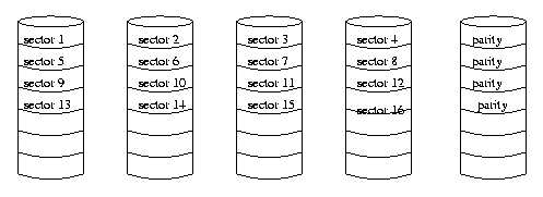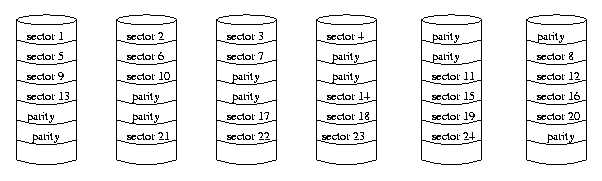 0 1 0 1 0 1 1 1 1 0 0 1 1 1 1 0 0 0 0 0 1 0 0 0 1 0 0 1 1 0 0 1 0 0 1 1 0 0 1 0Thus, the first disk has the byte 01001001, the second disk has the byte 11100010, the third disk has the byte 01100100, and the fourth disk has the value 11100101. These would typically be four consecutive bytes of a file. Note that the value on the parity disk is the result of performing an exclusive or operation on the four bit values.