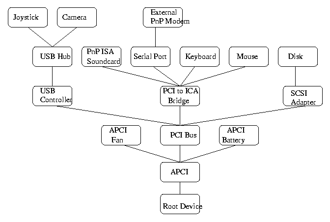 This leads to another feature of modern device management. The old model of a computer with a single bus has been replaced by a much more complex, multiple bus system. Compare Figure 1.6 on page 19 of your text with Figure 1.12 on page 31 of your text. An operating system with PnP will build a device tree at boot time, and update this as needed. Here is an example (copied from the Microsoft Device Driver Development Kit Help pages).