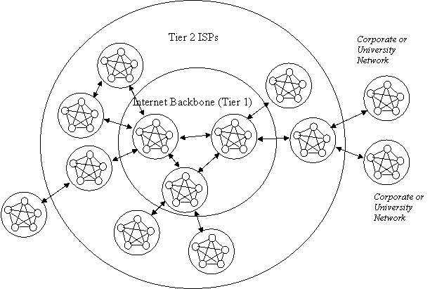 We can talk loosely of three tiers of networks. The outermost tier, tier 3, is the network of a company, a college, a government agency or other organization which has hosts connected to it. These have one or more connections to Internet Service Providers (ISPs), which constitute tier 2. These sometimes have direct connections to other ISPs, but they always connect to one or more Tier 1 providers, the Internet Backbone. These are large telecommunications providers such as Sprint, MCI, Qwest, Cable and Wireless, or AT&T.