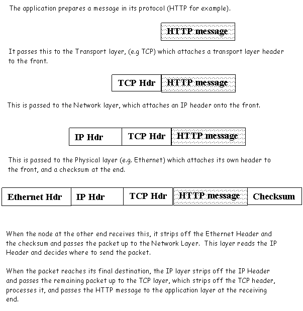 Each layer of the protocol stack on the sender side does its work by attaching a header (and sometimes trailing information as well) to the message which is passed down from the next higher layer in the stack. The Transport Layer receives a message from the application; it attaches a TCP header onto the front and passes this down to the network layer. The network layer appends an IP header onto the front of this and passes it on to the physical layer. The physical layer (Ethernet for example) attaches a header (and a checksum trailer) to this message and sends it to the next switching element.