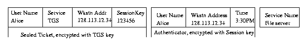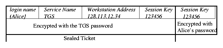 This ticket is encrypted using the TGS encryption key. A message is then formed containing this sealed ticket and the TGS session key, which is then encrypted using Alice's login password. This is sent to the Alice's login process.