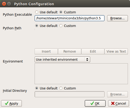 - For the Python Executable click on Custom and then Browse to the location for the Miniconda Python executable. This will be something like /home/stewart/miniconda3/bin/python3.6 See the following