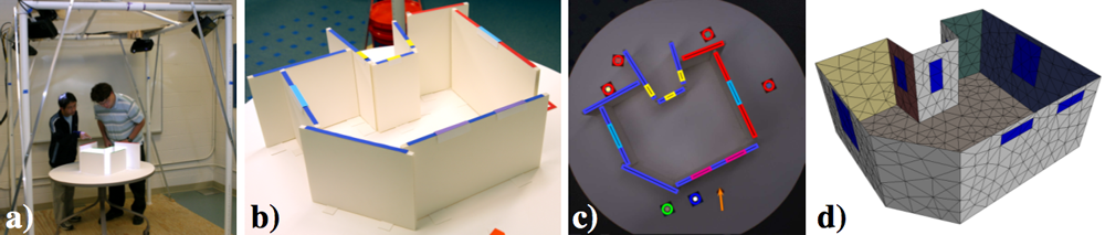Figure 1: In our physical architectural design environment a) users gather around a table and construct b) a small-scale mockup of a design from a collection of wall elements and marker tokens. A camera above the table c) captures the layout of elements on the table. Our sketch interpretation algorithm processes these elements to construct a consistent and watertight triangular mesh of the implied architectural design (ceiling removed for visualization).