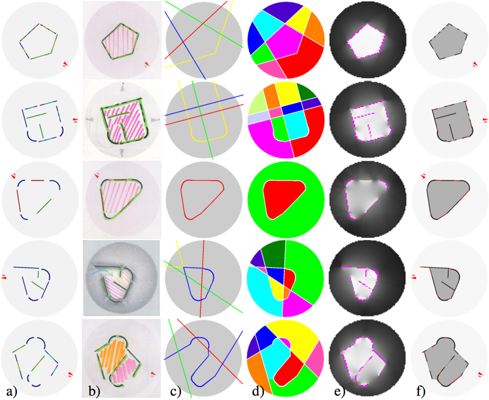 Figure 3: Dividing space into cells by extending tangents and connecting elements: a) detected primitives, b) annotation by original designer, c) wall chains, d) zones defined by the wall chains, e) enclosure, and f) our automatic interpretation.