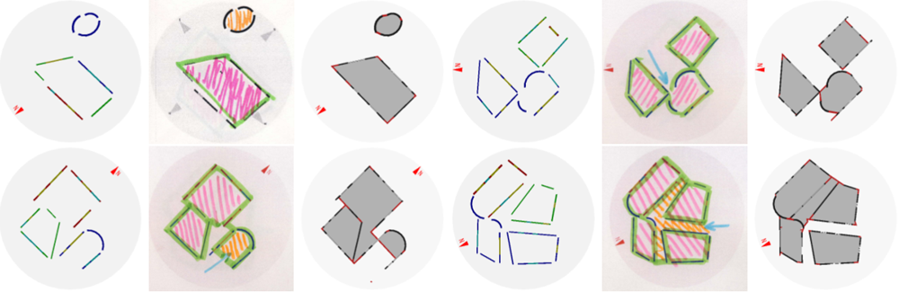 Figure 4: Designs with non convex boundaries may not be accurately extracted with a simple threshold on the average point or cell enclosure. By minimizing the lengths of unused wall and extra inferred wall necessary to enclose the interior zones we correctly interpret these complex designs.