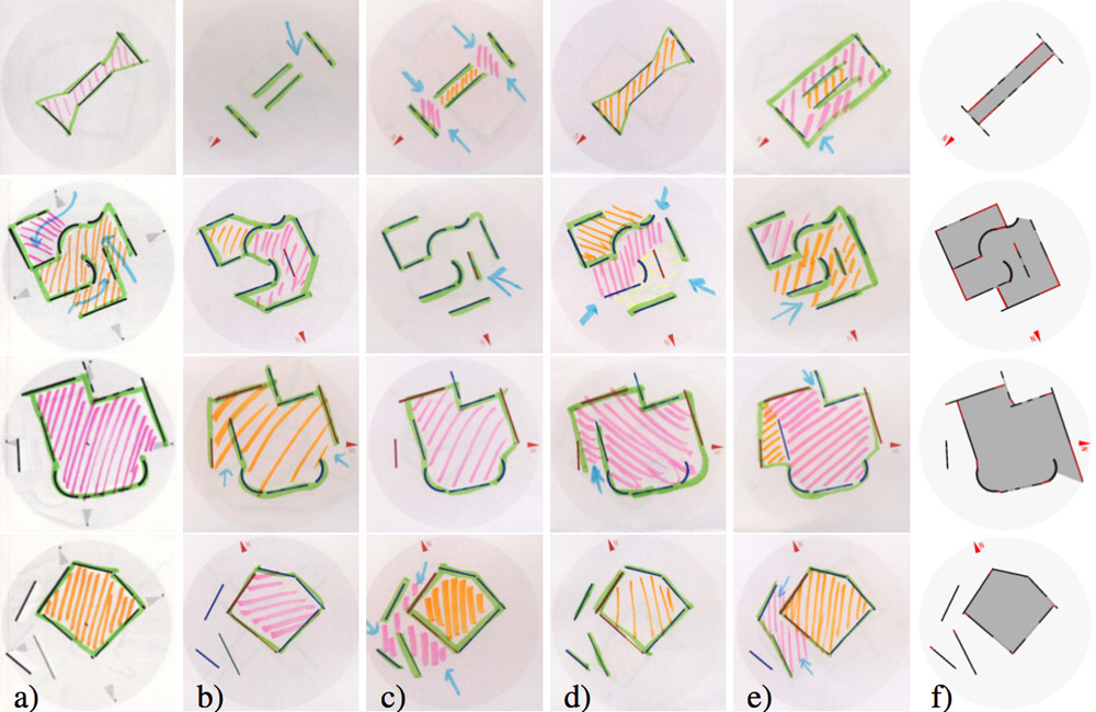 Figure 7: Domain-specific knowledge may be necessary to correctly interpret sketches that hint at common architectural forms, such as the cruciform used in church floor plans (top row) or to recognize an entrance portico (bottom row). Despite the potential for ambiguity, b-e) most users' interpretations matched a) the original designer's intention. Our automatic sketch interpretation results are shown in f).