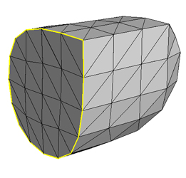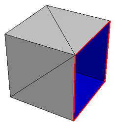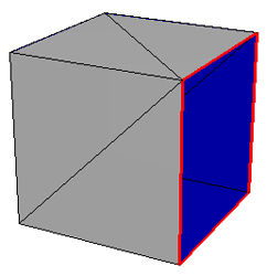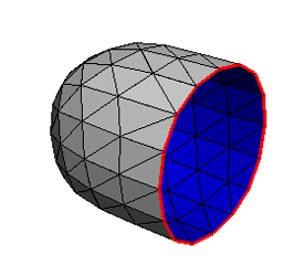 Notice that the adjacency data structure detects boundaries in the mesh and draws them with thicker red lines in the wireframe visualization and the interior or backside of the surface is blue: