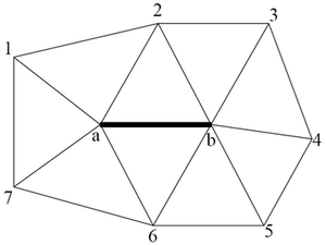 Think about what these errors might indicate is wrong with your implementation. (If you get a different error, of course, try to explain that one.) Certain edges should not be collapsed because it would cause the surface to become non-manifold. For example, the "ring" of vertices surrounding the target edge should be unique. In the diagram below, if vertices 1 and 4 refer to the same vertex, then after the collapse of the solid black edge, four triangles will meet at the same edge. This proposed edge collapse will alter the topology of the model and yield a non-manifold condition. Write code to check for these conditions. NOTE: This code can be tricky. It's ok if you only just catch some of these conditions and your program still crashes occasionally. Don't spend too long trying to make it perfect. Discuss this in your README.txt file.