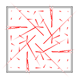 The images below show some visualizations of this dataset of random particles on a 5x5x1 grid. On the left we see the random particles (approximately 64 per cell) and the random initial velocities measured at the center of each cell. Marker particle visualization and velocity visualization are toggled by pressing the 'm' and 'v' keys. Remember that the velocities are actually stored as vectors perpendicular to the face of each cell, visualized by red (x) and green (y) triangles (toggled by pressing the 'e' key). The velocity at the center of each cell (drawn as a line segment colored red->white) is computed by averaging the velocities at the faces on either side of the cell.