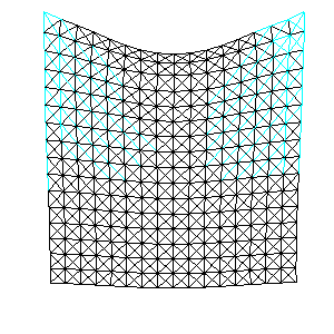 Once your basic spring-mass system is working, test it on the larger example below. As illustrated by Provot, the springs at the corner will stretch too much. Implement the iterative correction/adjustment method for springs that have stretched beyond the specified threshold. The provided code will visualize the "over-stretched" springs in cyan (shown below).