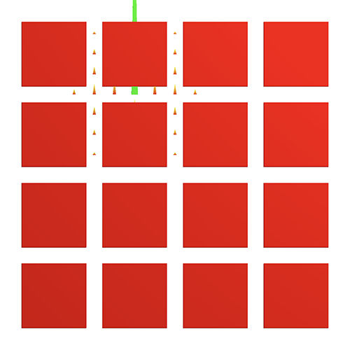 To move particles within the field, we need to compute the velocity at an arbitrary position within the volume (not just the cell center). The simplest (but incorrect) thing to do is just use the velocity at the center of the cell for all particles in that cell. The image below left shows this discontinuous velocity field (press 'd' to visualize this "dense" velocity field). Go ahead and press 'a' to animate the particles within this field and you should see why this isn't a good assignment of velocities.