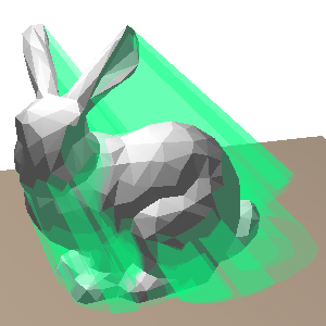 Once these edges are found, we can construct the polygons that form the "sides" of the shadow volumes. These polygons are extrusions of the silhouette edges away from the light source, towards infinity. Pressing 'p' will toggle the visualization of these polygons in green, as shown below, using blending so you can partially see through these polygons and see the depth complexity of the multiple layers of shadow volume polygons. [ NOTE: Currently the blending is broken, so they will be opaque green polygons. ] You need to write the code to construct and render these polygons.