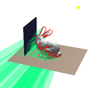 The last step is to do the multi-step rendering to create the shadows. This involves juggling the frame buffer, depth buffer, and stencil buffer. The basic idea is to first render the scene without lighting. Then, we do a special rendering pass of the shadow volume polygons: everywhere the depth buffer passes, we will increment (if the shadow volume polygon faces toward the camera) or decrement (if the shadow volume polygon faces away from the camera) the stencil buffer. Finally, we render the scene a second time with the lights on, but only where the stencil buffer is zero. The shadow rendering mode is toggled by pressing 's'.