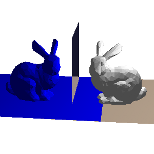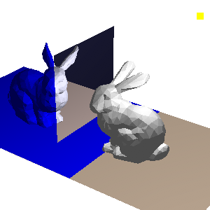 If you study the resulting imagery closely, you'll notice that the lighting is decidedly incorrect. The bunny in the mirror has different local shading than the physical bunny. Which light source(s) should that bunny be lit by? For extra credit, describe the problem in your README.txt file and improve the local shading on the mirrored bunny. (Actually, the lighting on the physical bunny is wrong too and can be improved!)