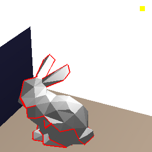 Next, let's implement shadow volumes. The first step is to determine the silhouette edges in the model. These are edges that have one neighboring triangle facing toward the light source, the other triangle facing away from the light source. Pressing 'e' will toggle the visualization of these edges in red, as shown below. You need to write the code to determine which edges are silhouettes and render this geometry.