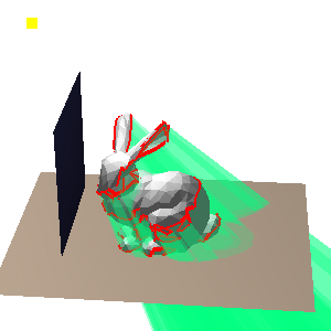 The last step is to do the multi-step rendering to create the shadows. This involves juggling the frame buffer, depth buffer, and stencil buffer. The basic idea is to first render the scene without lighting. Then, we do a special rendering pass of the shadow volume polygons: everywhere the depth buffer passes, we will increment (if the shadow volume polygon faces toward the camera) or decrement (if the shadow volume polygon faces away from the camera) the stencil buffer. Finally, we render the scene a second time with the lights on, but only where the stencil buffer is zero. The shadow rendering mode is toggled by pressing 's'.