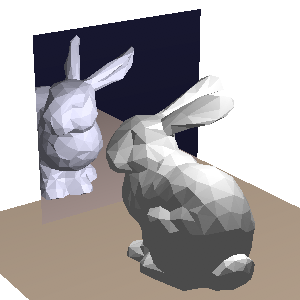 If you study the resulting imagery closely, you'll notice that the lighting is decidedly incorrect. The bunny in the mirror has different local shading than the physical bunny. Which light source should that bunny be lit by? For extra credit, describe the problem in your README.txt file and improve the local shading on the mirrored bunny. (Actually, the lighting on the physical bunny is wrong too and can be improved!)