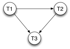 Node T1 has no incoming edges, so it must come first.